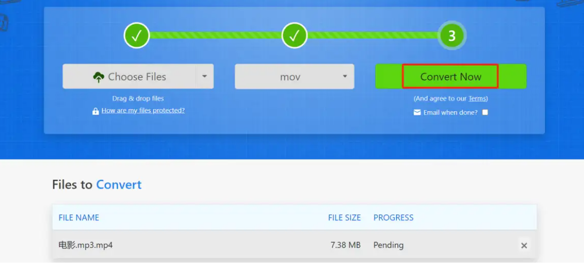 点"Convert Now"按钮,稍等片刻(根据文件大小,小文件1分钟内,大文件可能要3-5分钟)。转换完成后点"Download"就能把MP4文件存到电脑里了。