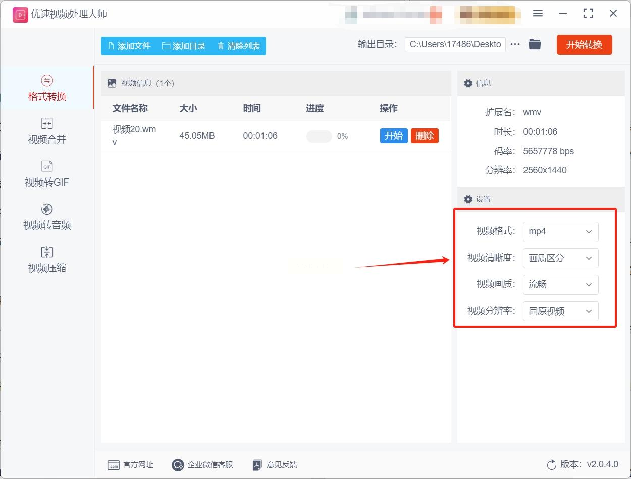 在"输出目录"那里点一下,选个你容易找到的文件夹,比如桌面新建个"WMV转MP4"文件夹,这样转换完不用到处找文件。