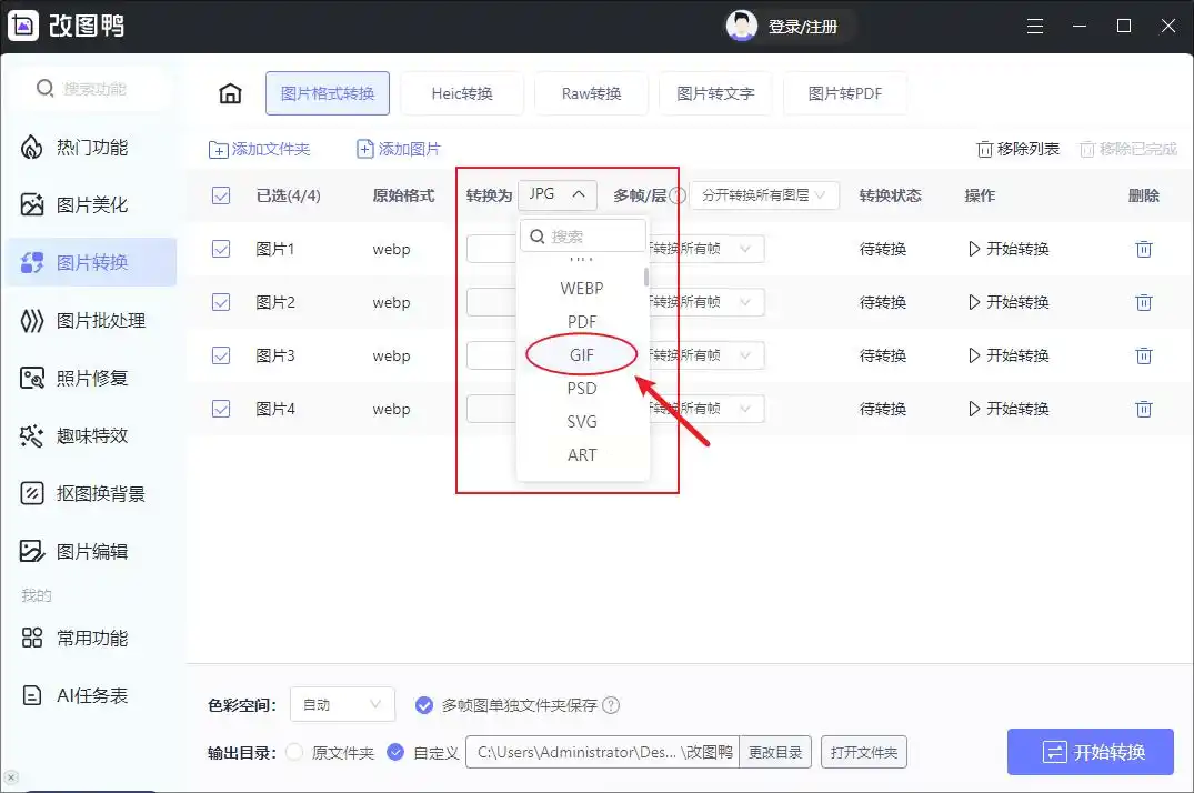 步骤二:上传文件后,在格式列表中选择GIF作为输出目标,并可选择是否合并多帧或仅保留首帧画面。