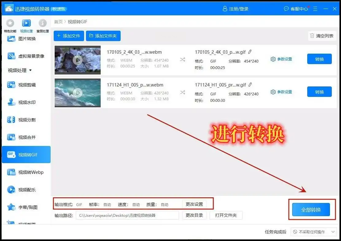 步骤四:确认设置后,点击“全部转换”按钮,静待片刻即可在输出文件夹中获取GIF文件。