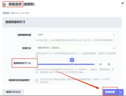 步骤三,在“高级选项”区域,你可以手动设置希望压缩到的文件大小。设置好后,选择“应用设置”确认。