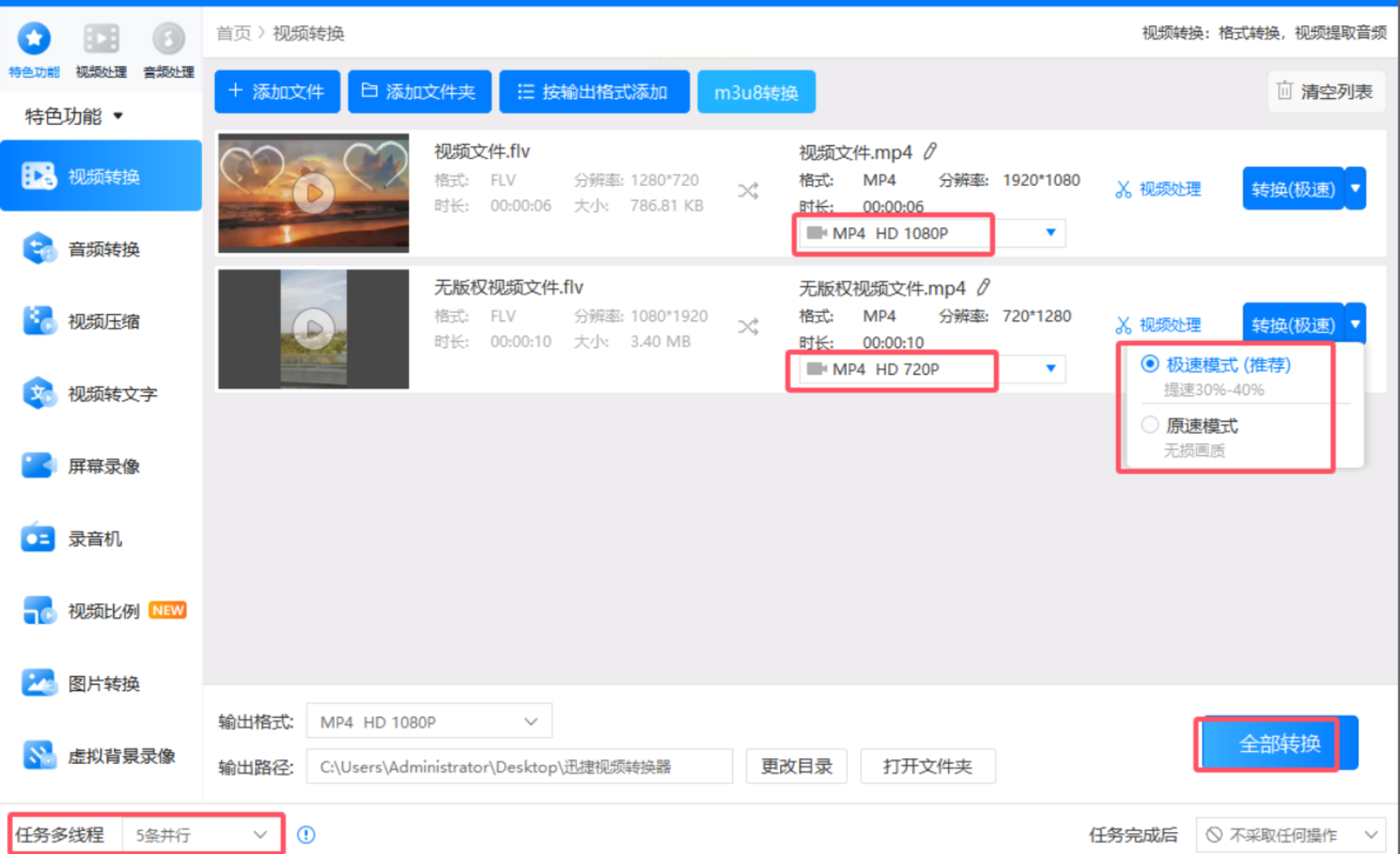步骤三:选择转换模式时,推荐使用“极速模式”,它能将处理速度提高30%-40%,而“原速模式”则更适合对画质有严格要求的场景。确认设置后,点击“全部转换”按钮,等待进度条完成即可查看结果。
