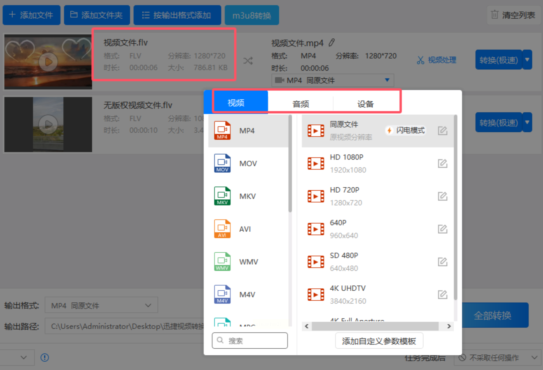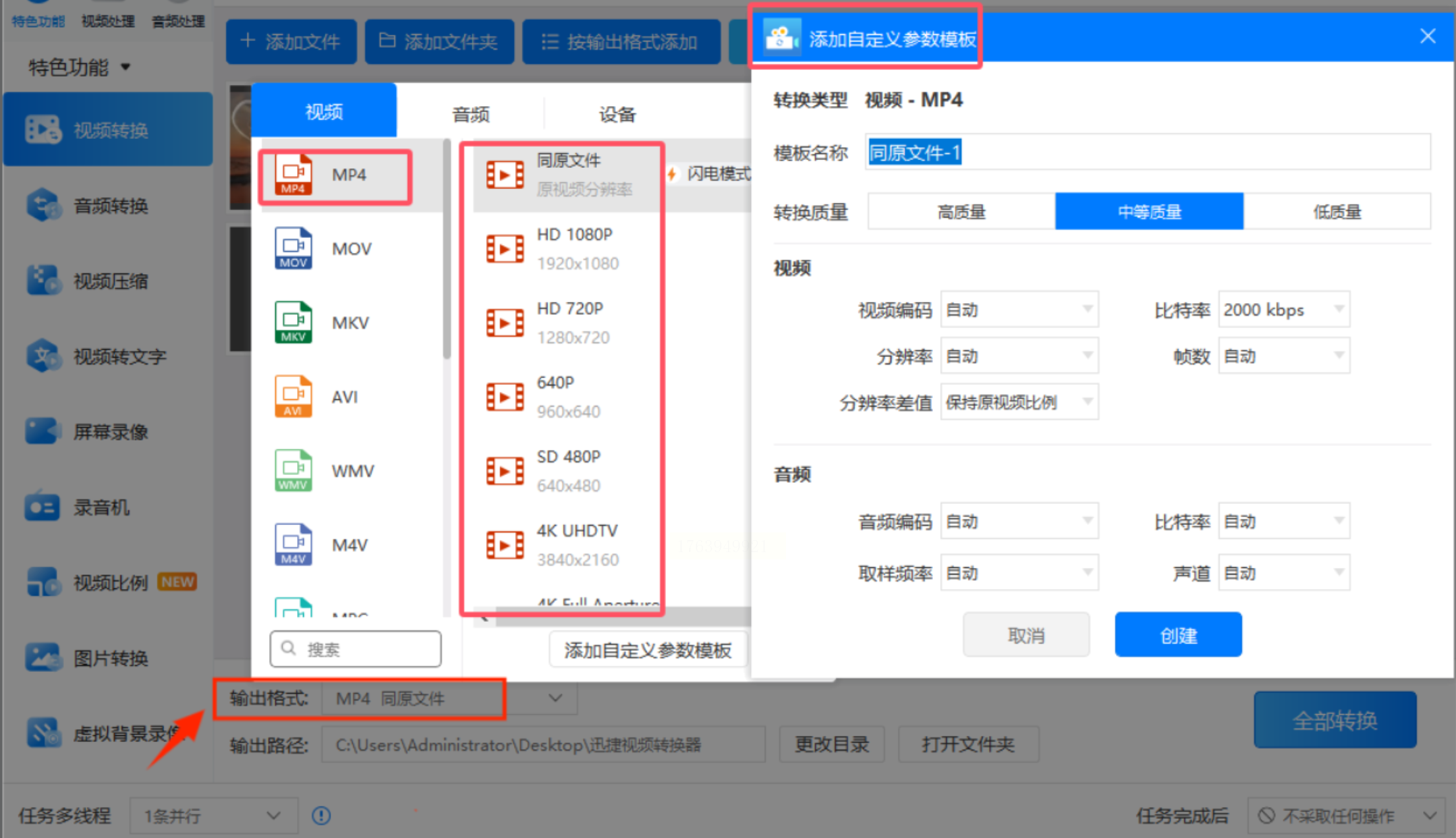步骤二:在输出设置中,默认格式为MP4,用户无需更改。但可以自定义分辨率选项,包括六种预设模式或手动调整参数,以适应不同设备需求。软件允许同时处理多个文件,提升批量转换效率。