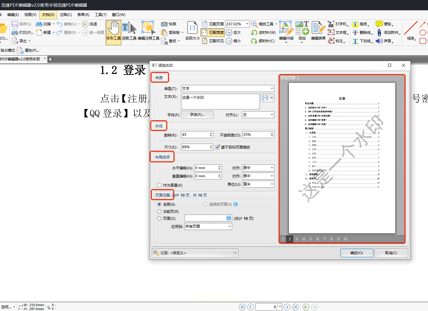 步骤四:调整水印位置和页面范围,可以通过预览确认效果。