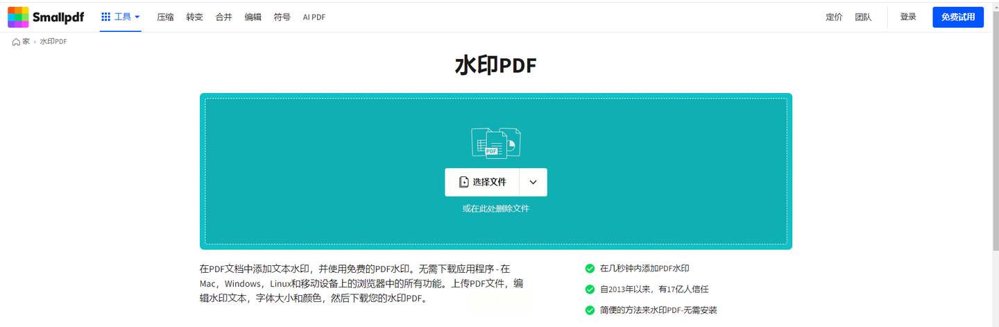 SmallPDF是一个国外知名的在线PDF处理平台,无需安装软件,通过浏览器就能完成添加水印、格式转换等操作,适合偶尔使用或不愿下载软件的人群。