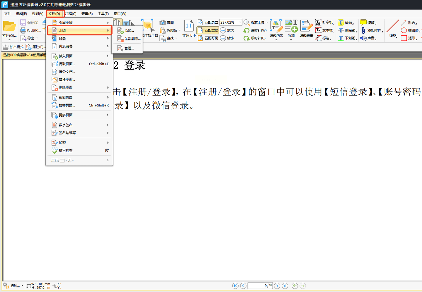 步骤二:点击“编辑”菜单,选择“水印”下的“添加水印”功能。