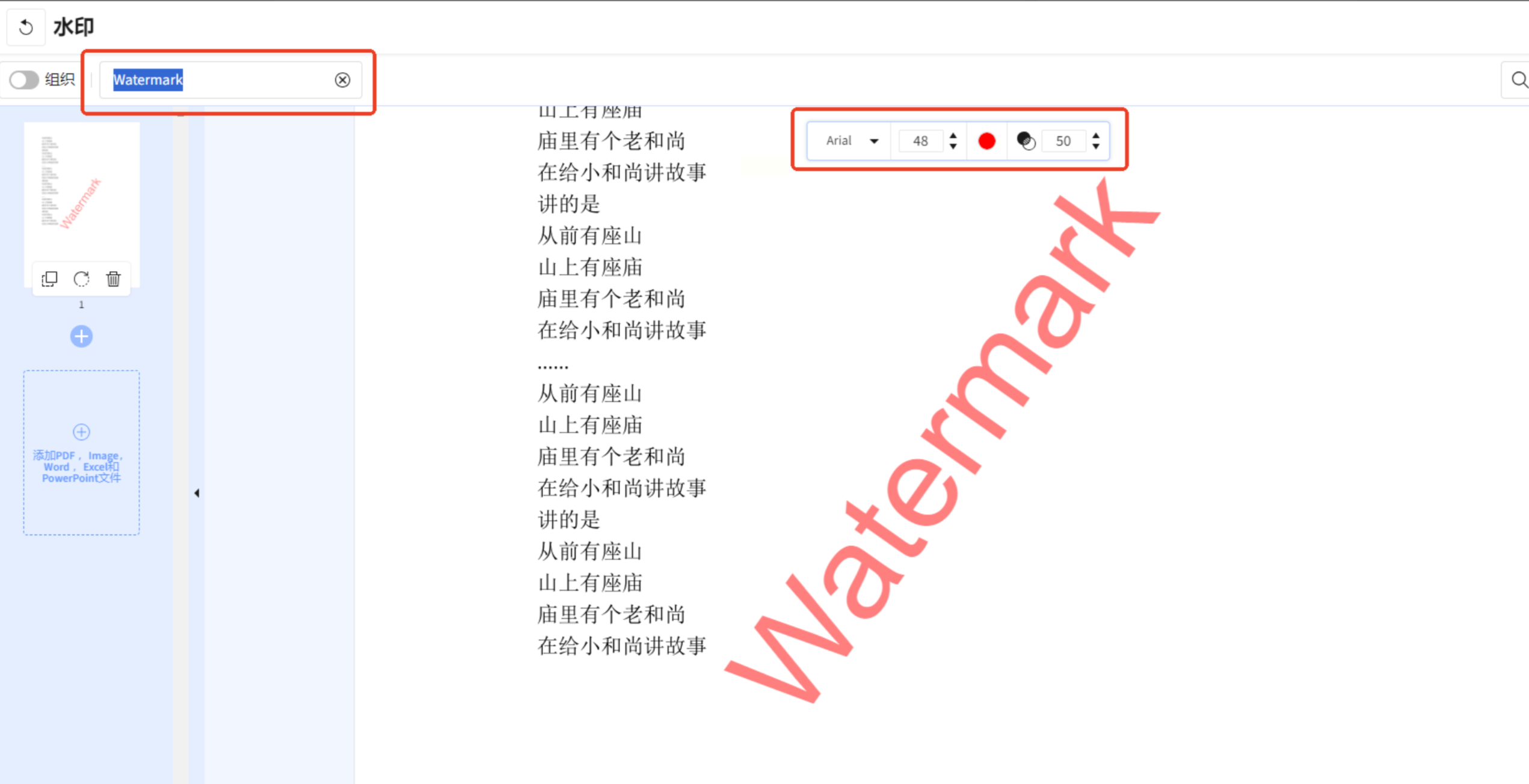 3. 看软件右侧,这里就是设置水印的地方。选择“添加文字水印”,然后在下面的文本框里输入你们公司的名称或者“保密”之类的字眼。