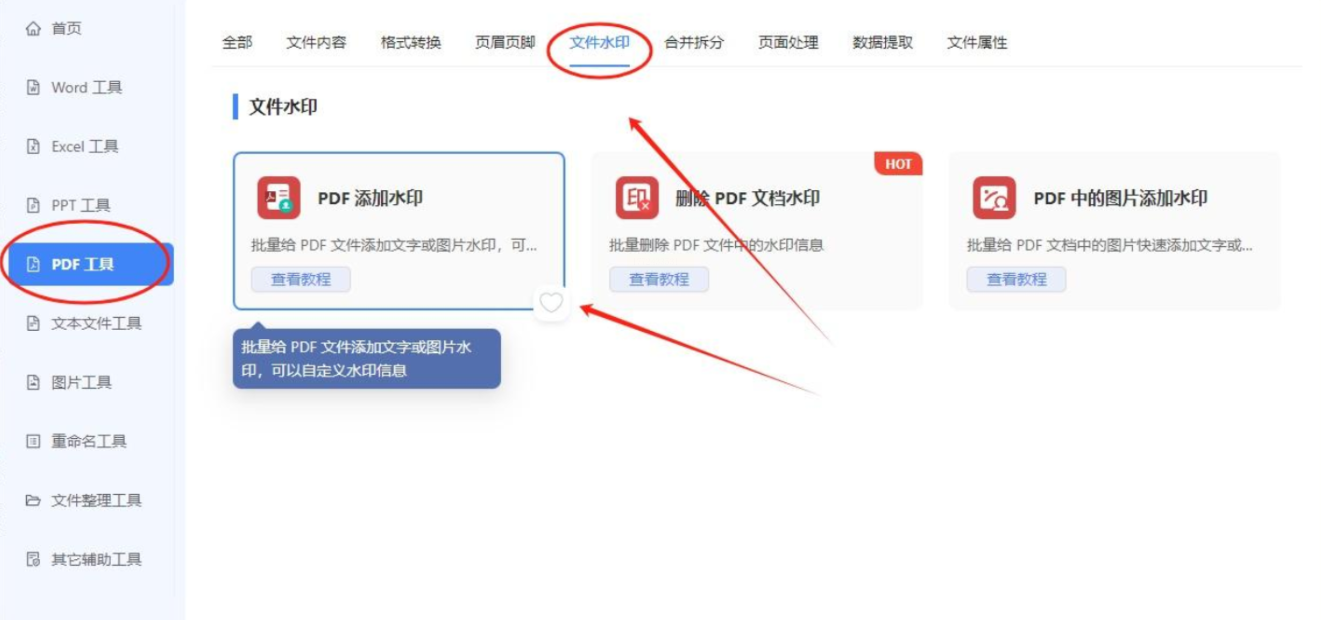 ⚠️注意:这里别选错功能!别点成图片加水印了,要看清楚“PDF工具”的分类。
