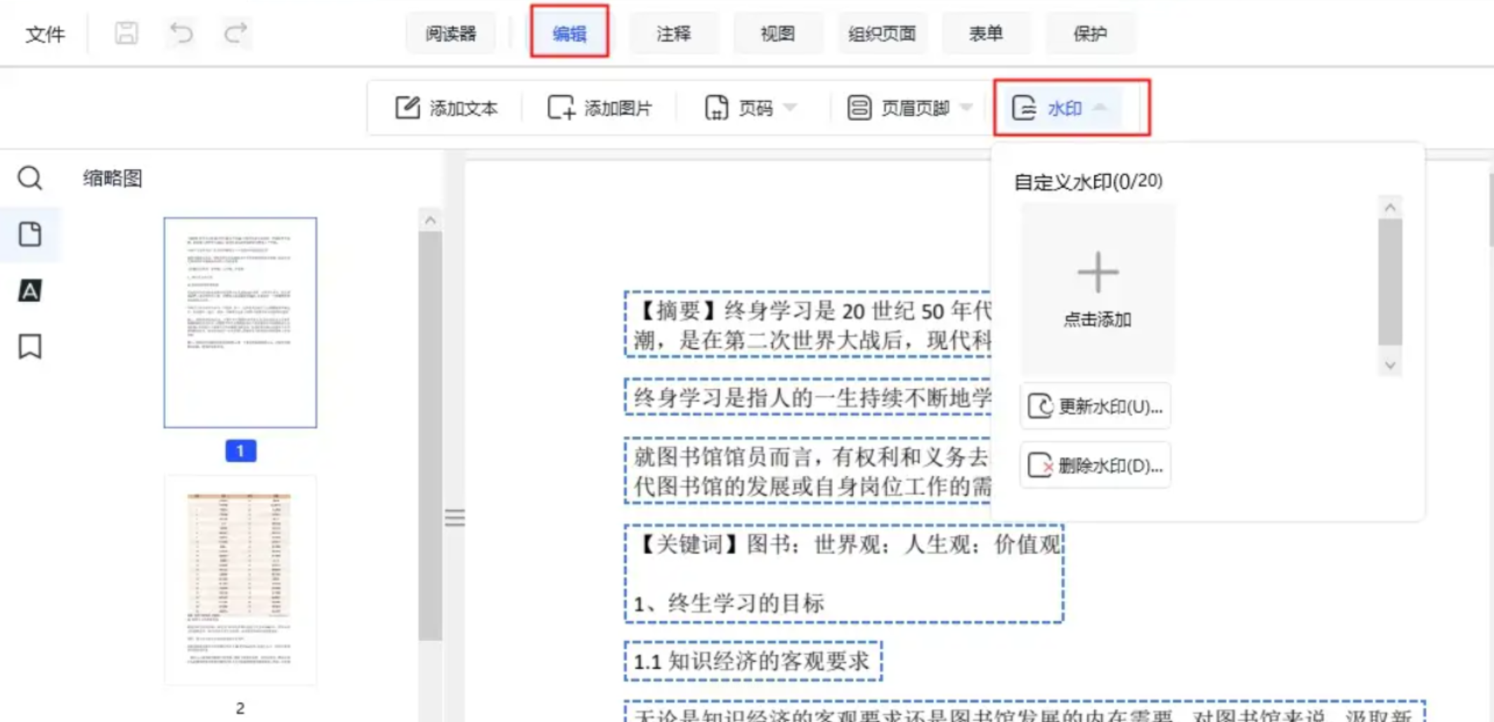 步骤二:定位水印管理功能。 在软件的功能区菜单(通常在上方或侧边栏)中,找到“水印”选项。这里你不仅可以添加新水印,还能管理(更新、删除)文档中已有的水印。