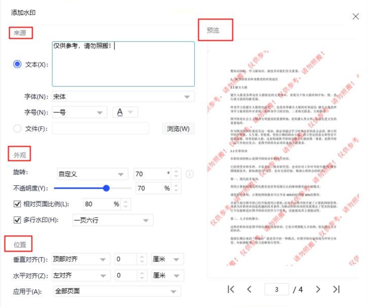 布局位置:精确设定水印出现的页面范围(全部页面、指定页码)、在页面上的具体位置(居中、对角、自定义坐标)、旋转角度以及平铺的数量和间距。