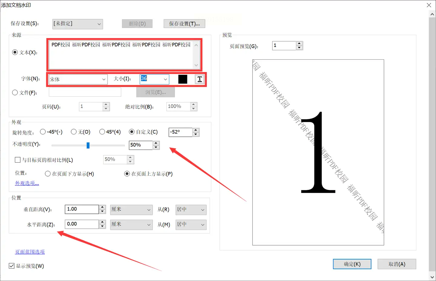 步骤四:以文字水印为例,设置内容、字号、旋转角度,建议透明度设为30%-50%