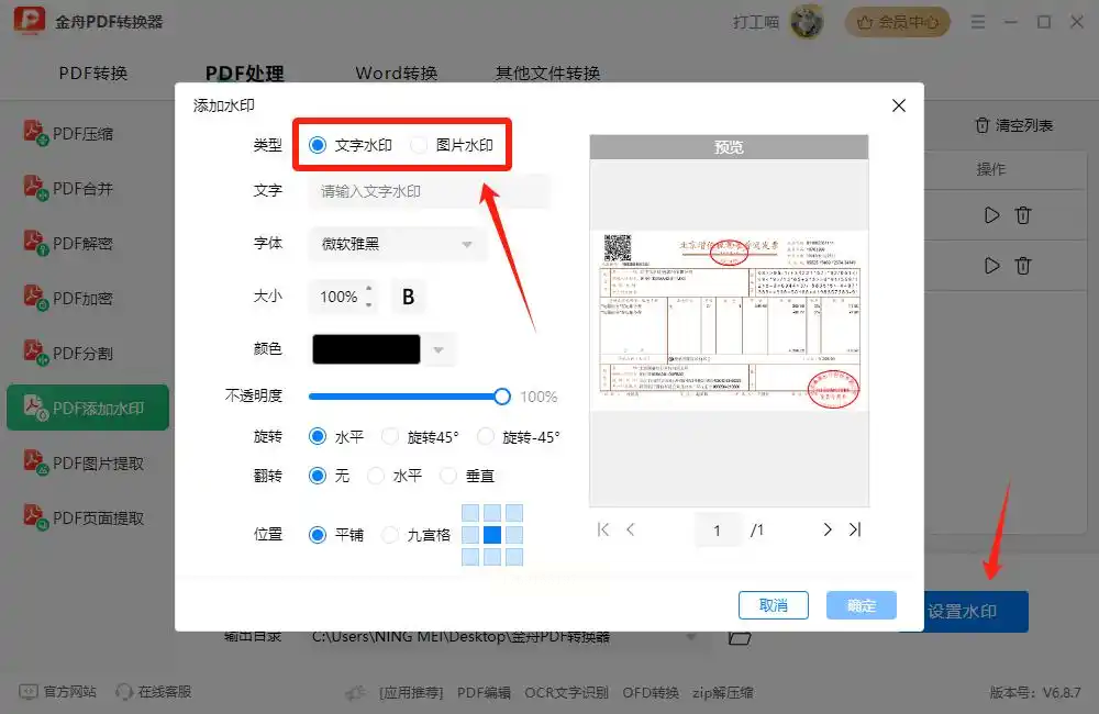 步骤四:点击【设置水印】按钮,可选择文字/图片类型,设置内容、颜色、透明度等参数