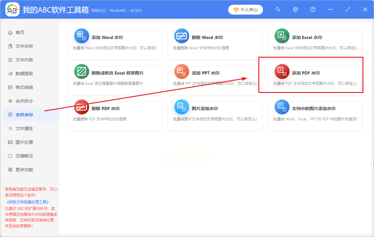 步骤二:在功能列表中找到【PDF添加水印】选项