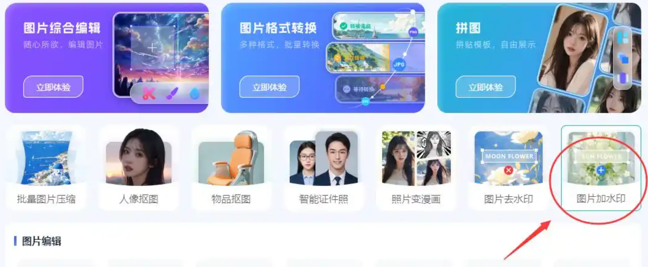 1. 进入官网:打开美图秀秀网页版(pc端),点击「图片编辑」功能。