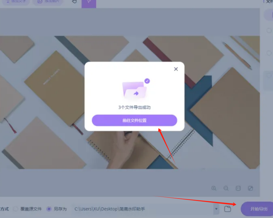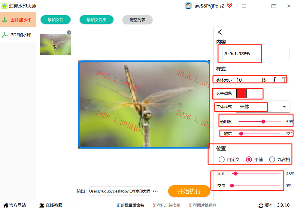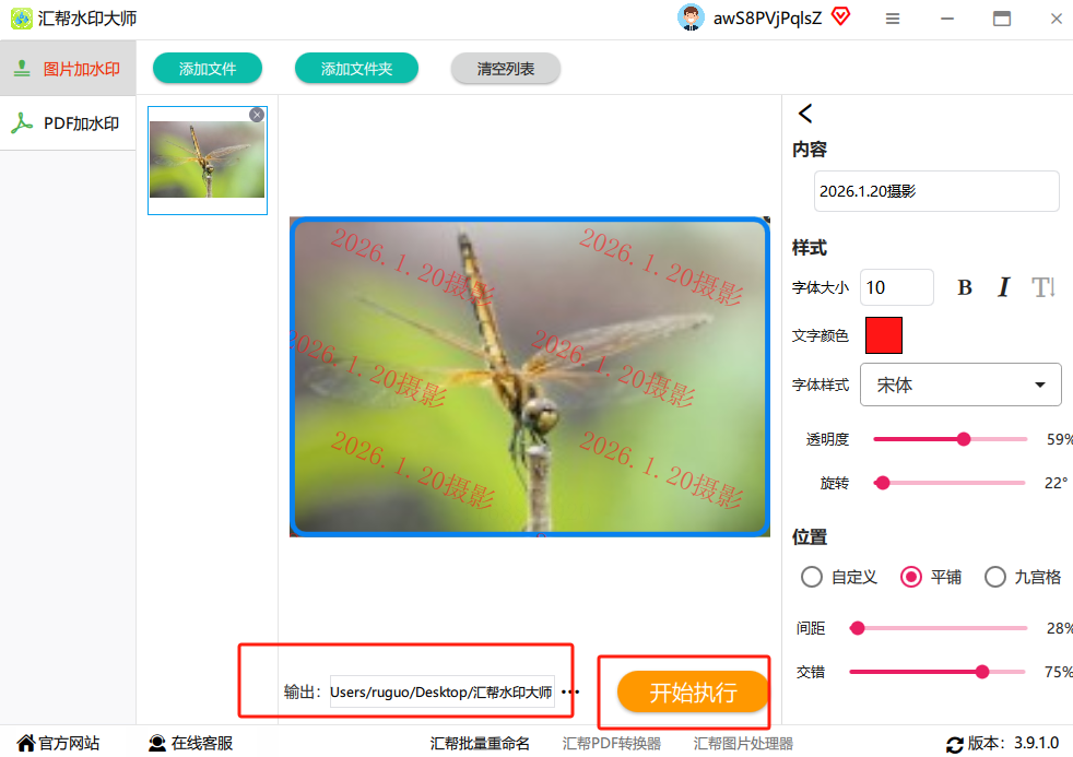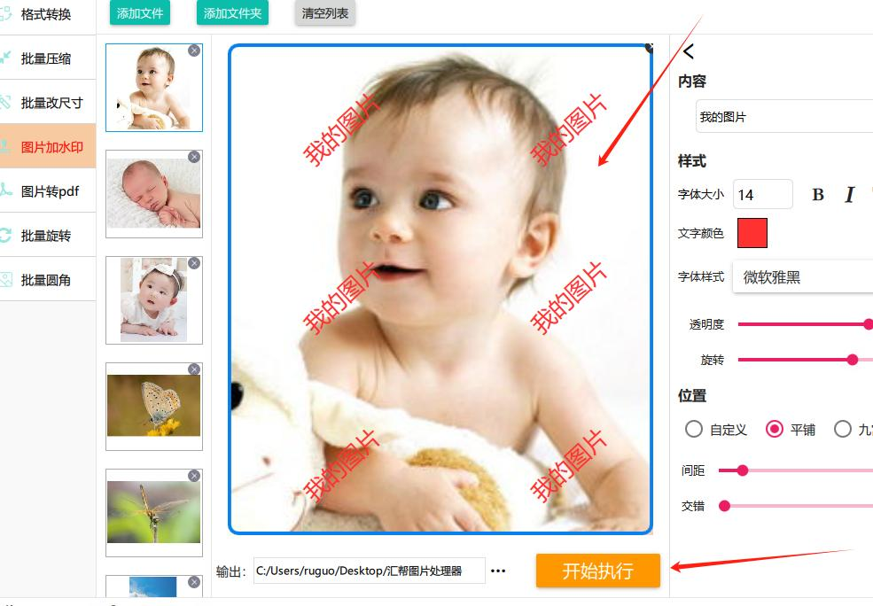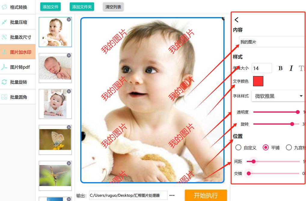5. 设置好水印参数后,接着设置输出格式、文件夹等,最后点击“开始”或“应用”,软件就会自动为所有选中图片添加统一的水印。