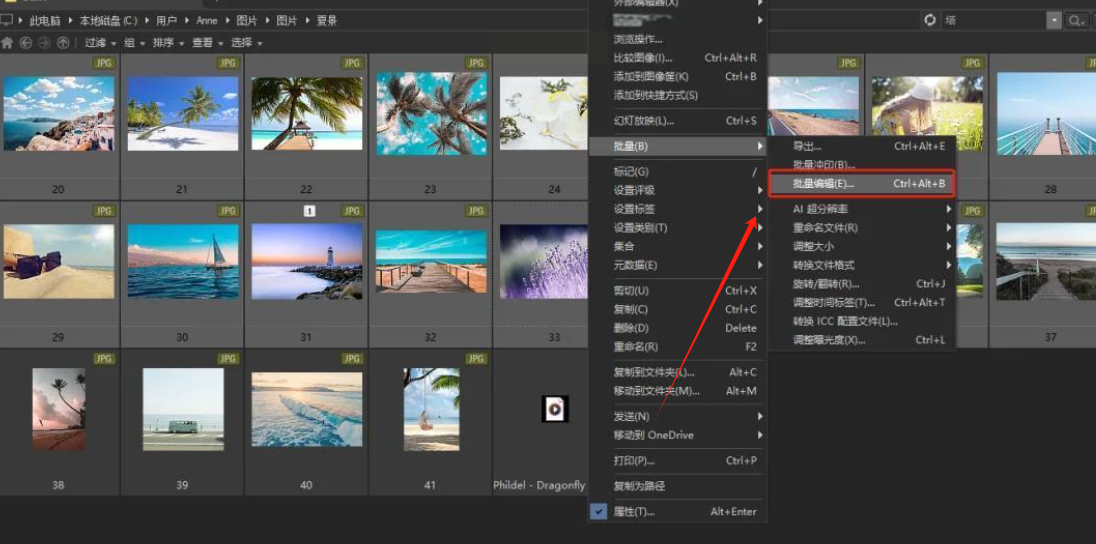 2. 在菜单栏或右键菜单中找到“批量”或“工具”下的“批量编辑”或“批量添加水印”功能。