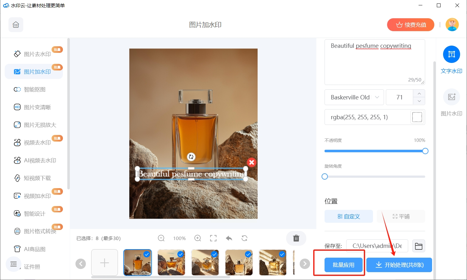 4. 调整完毕后,先点击“批量应用”将设置同步到所有图片,然后点击“开始处理”。