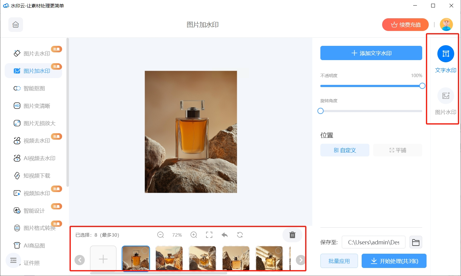 2. 它支持批量操作,一次性可以导入多张图片(比如30张)。界面里会清晰地区分“文字水印”和“图片水印”选项。