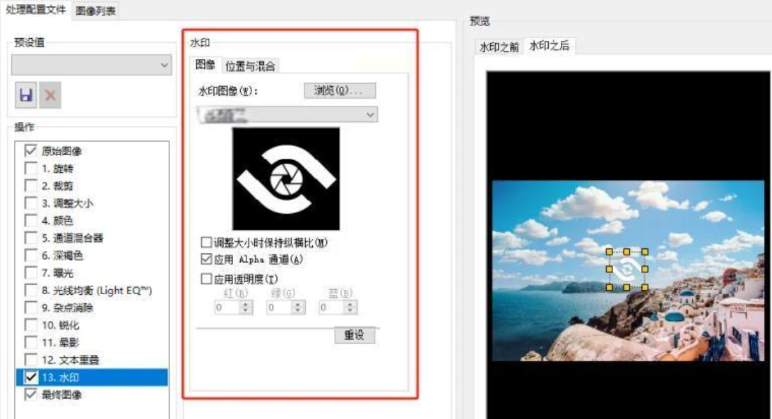 3. 在弹出的批量操作面板中,找到“水印”或“叠加图像”选项。点击“浏览”上传你的水印图片(通常是PNG格式带透明背景的Logo)。