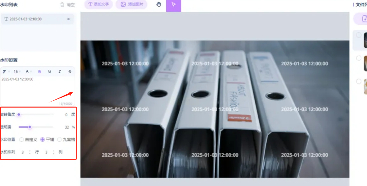 假设我们选了文字水印,右侧的设置面板就活络起来了。在这里,你可以尽情发挥: