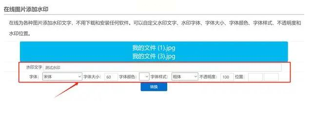 - 如果是文字水印,输入文字内容,设置字体、大小、颜色、位置和透明度;