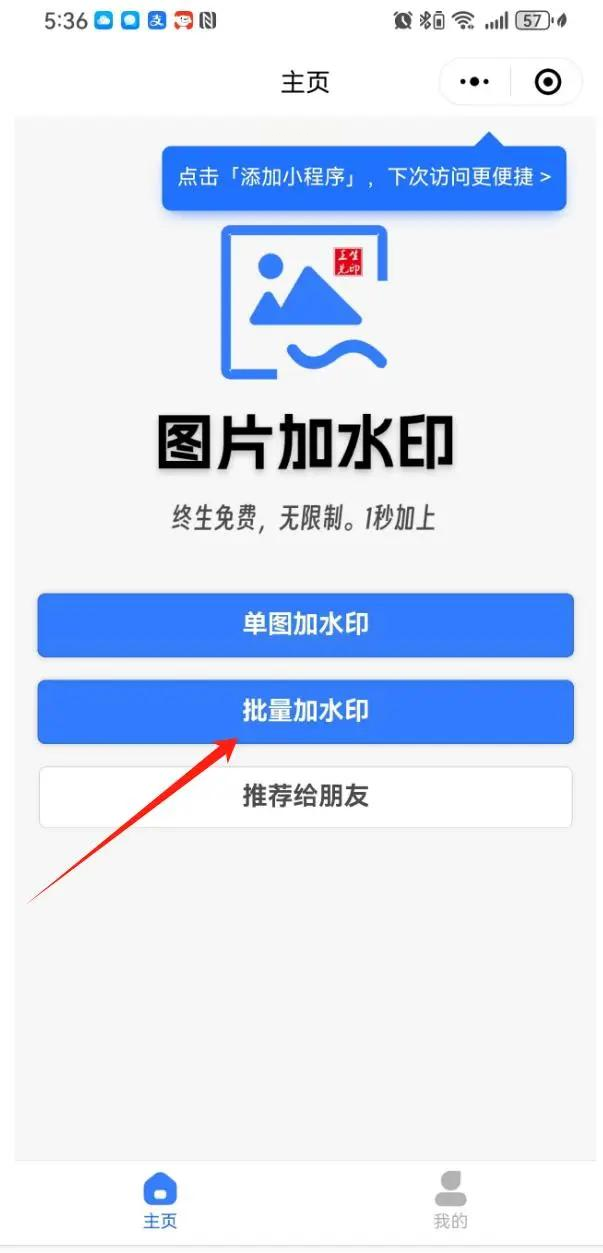 2. 选择批量加水印功能:进入小程序后,首页会有“单图加水印”和“批量加水印”两个选项,根据需要选择“批量加水印”,这样可以一次性处理多张图片。