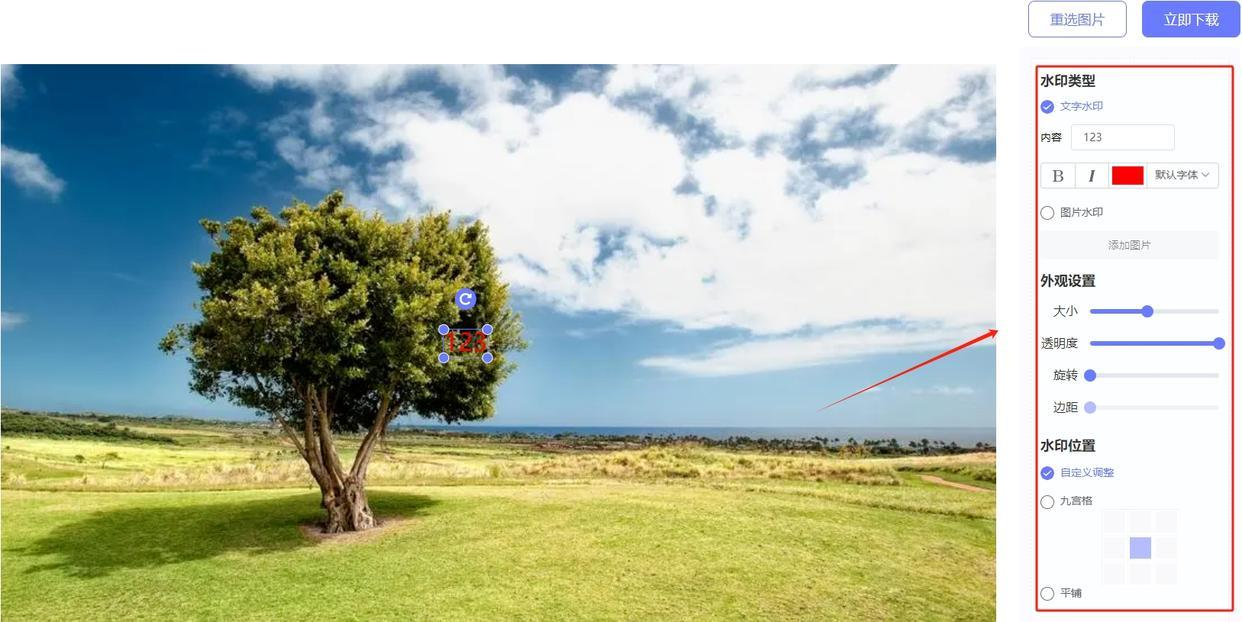 3. 设置水印样式:上传完成后,界面右侧会出现水印设置面板。这里可以选择“文字水印”或“图片水印”: