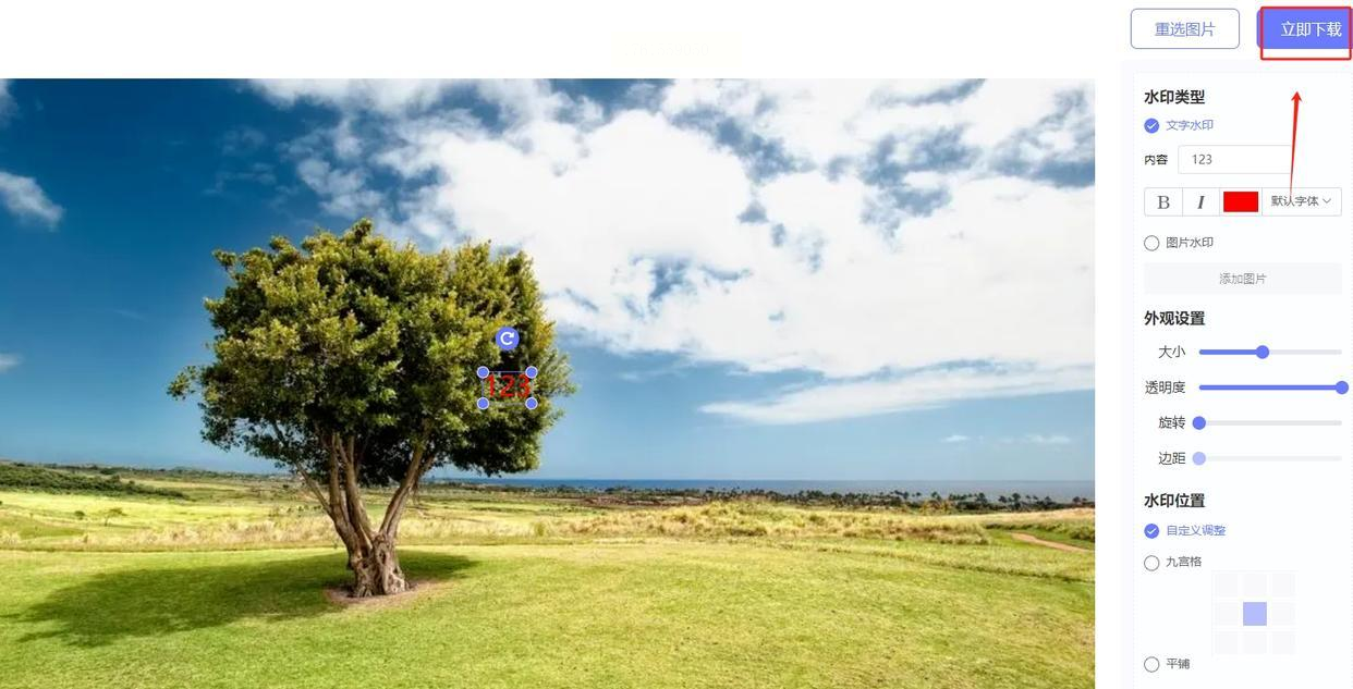 5. 预览效果并调整:左边的实时预览区会显示水印添加后的效果,你可以拖动水印位置,调整透明度和旋转角度,确保水印既显眼又不遮挡图片主体。