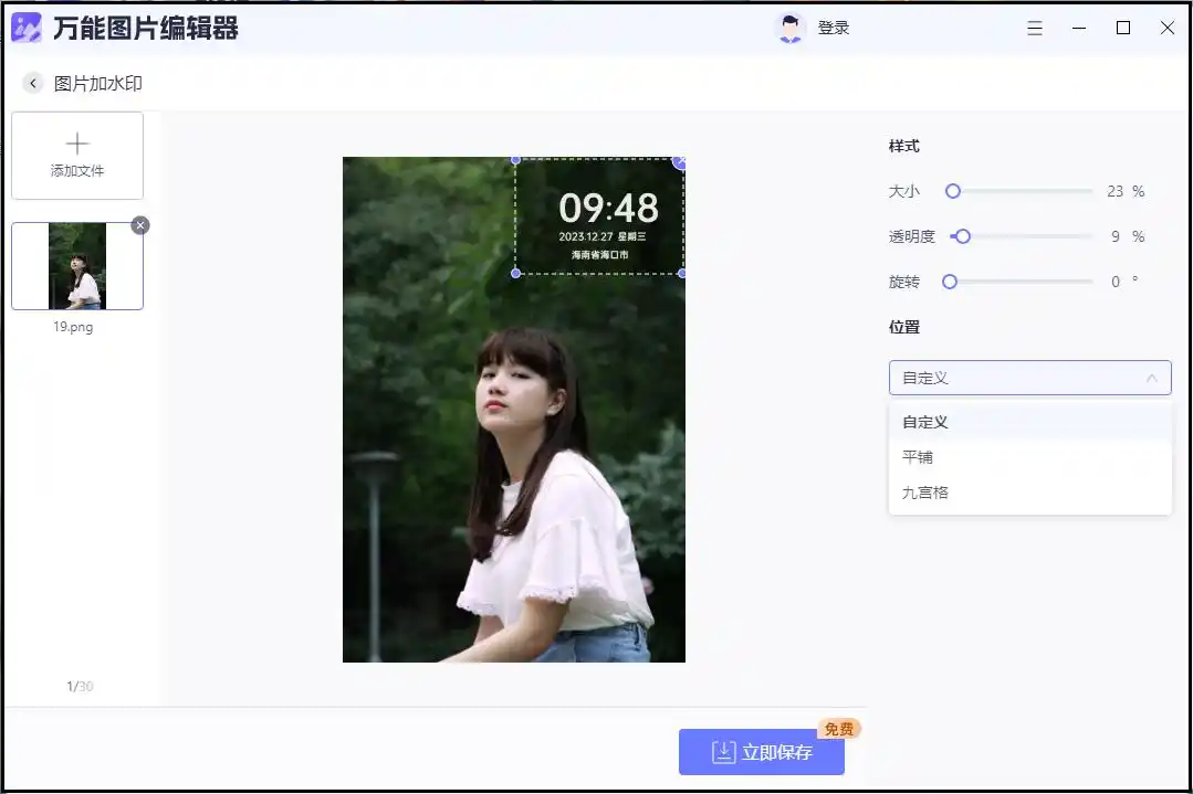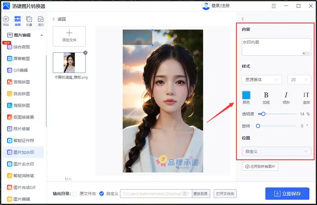 您可以从软件自带的精美水印模板库中挑选,也可以选择自定义文字或上传图片作为水印。在右侧的编辑面板中,可以对水印内容、字体、颜色、大小、位置、透明度等进行全方位调整。所有参数设置完毕后,点击“立即保存”或“全部应用”,软件便会快速完成处理并输出成品。