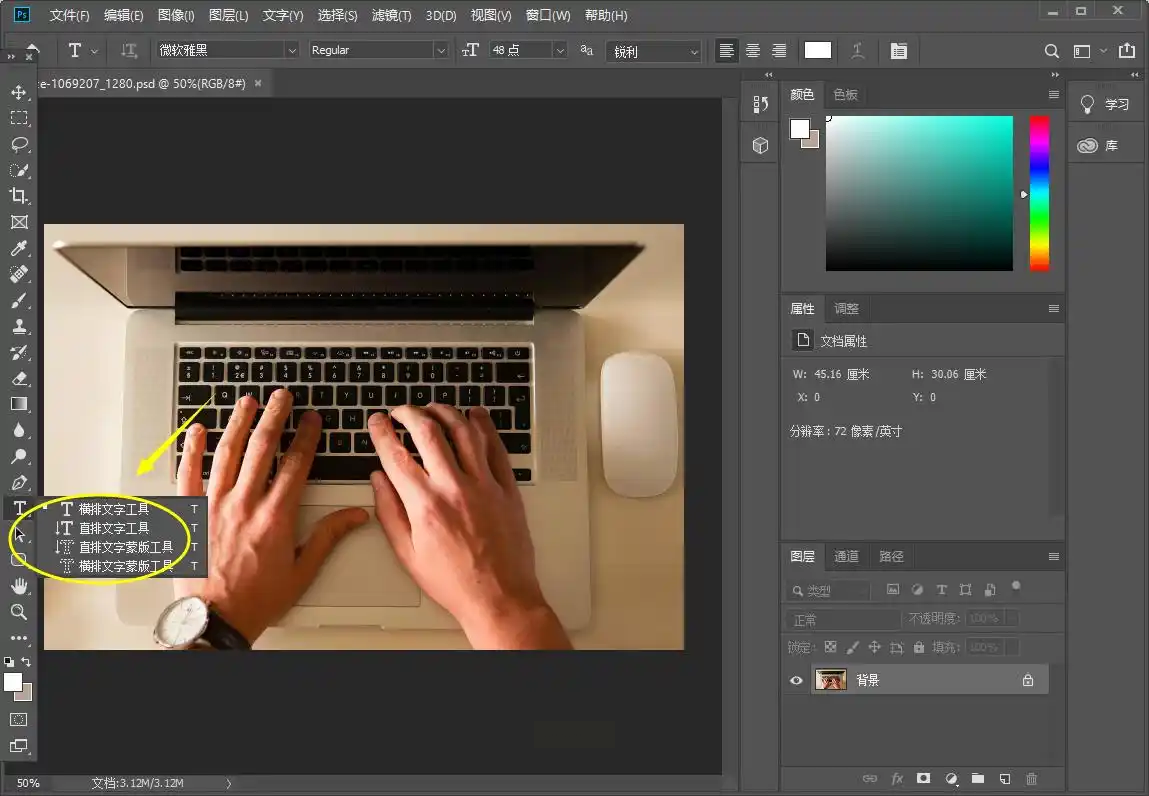 在电脑上运行Photoshop,打开目标图片。利用工具栏中的“文字工具”或“形状工具”,在画布上创建水印内容。