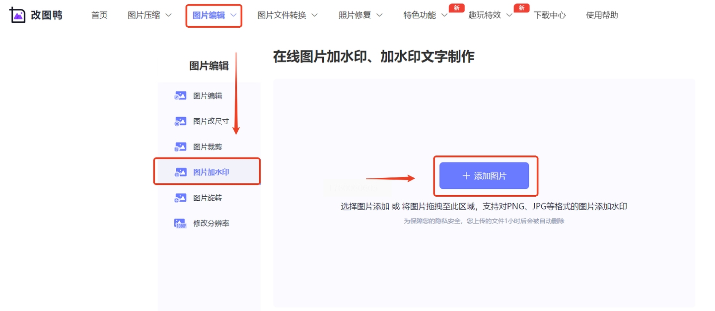 步骤一:访问网站,点击“图片编辑”中的“图片加水印”,上传图片。