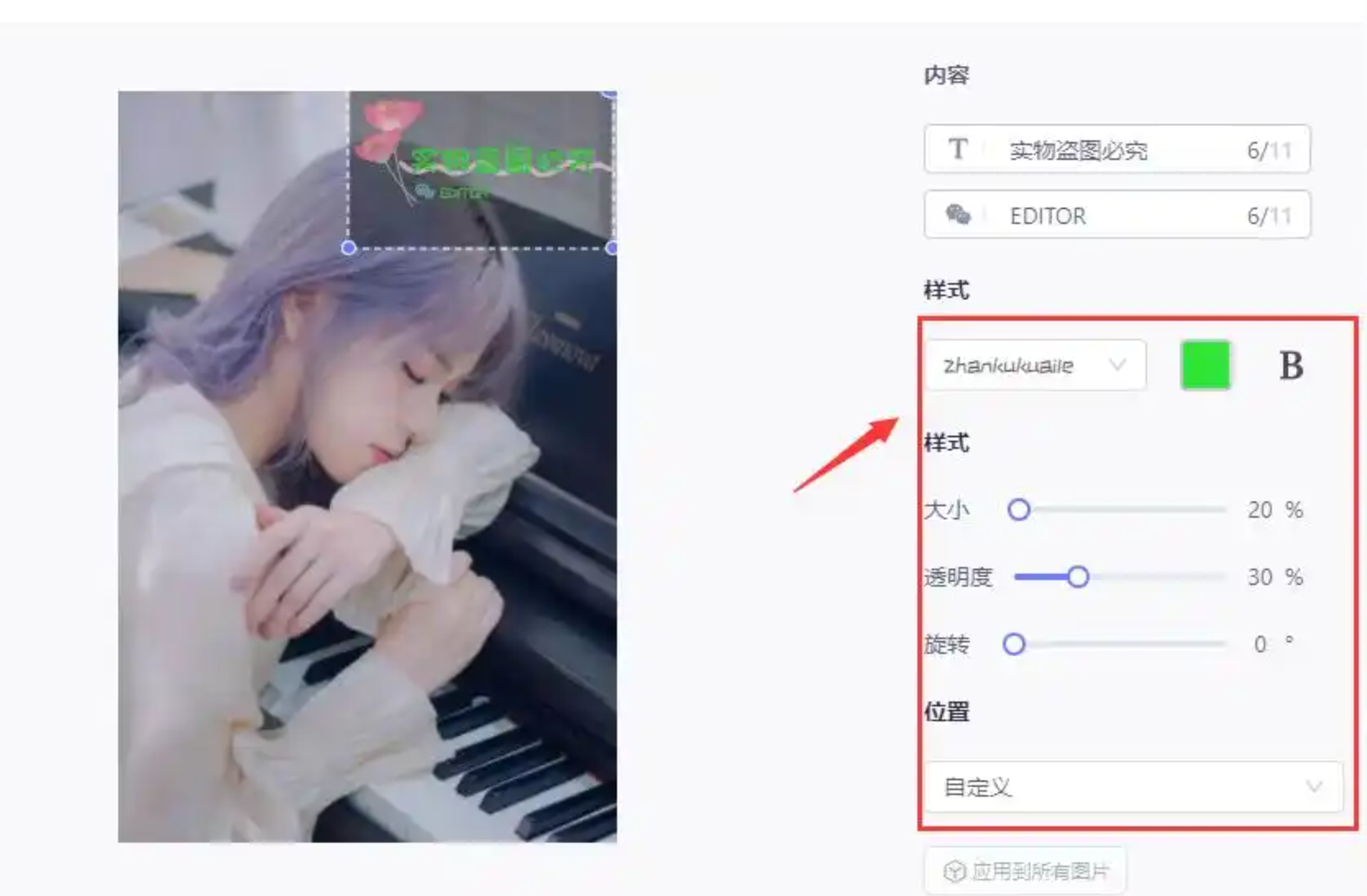 3. 模板水印可直接编辑文字内容,调整字体(系统自带+网络字体库)、旋转角度(0-360°)、阴影效果;