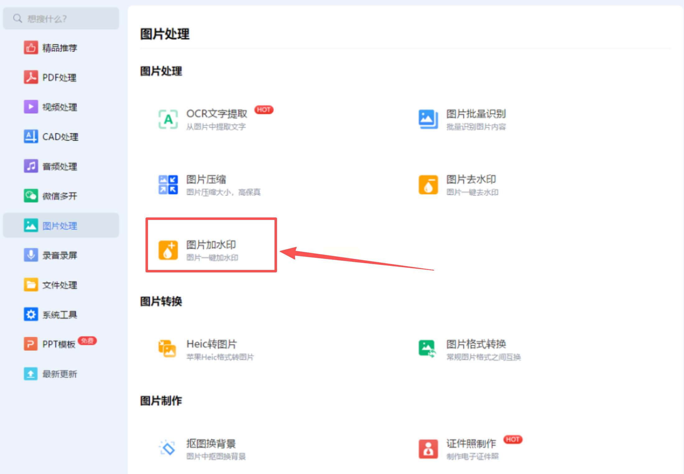 1. 打开软件后在「图片处理」分类中找到「图片加水印」功能;
