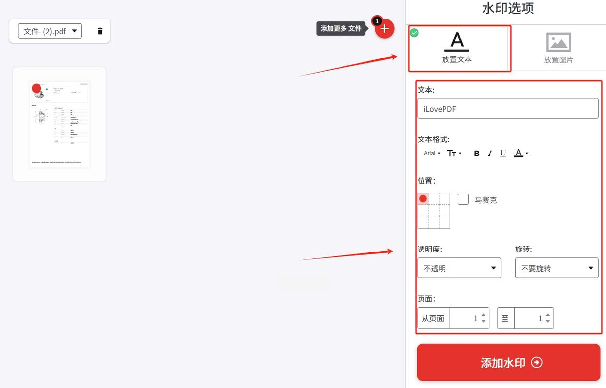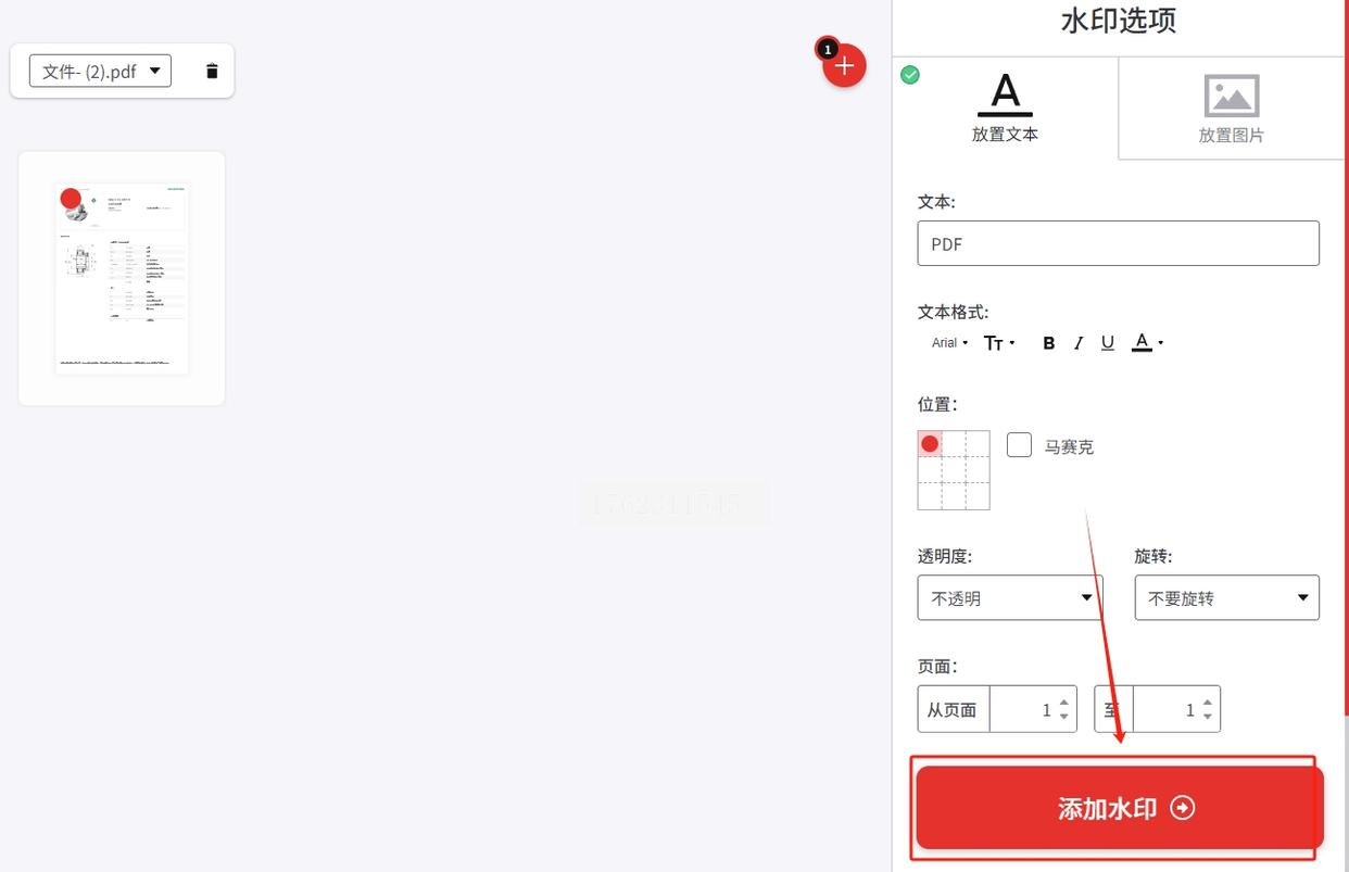 3. 设置文字水印:上传完成后,在工具界面找到“水印类型”,选择“文本水印”,然后在输入框里输入水印内容(比如“版权所有”)。下方可以调整字体、颜色、大小、透明度,还能设置水印的位置(居中、左上角等)。