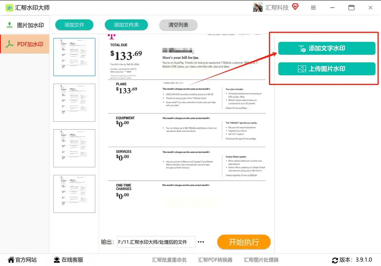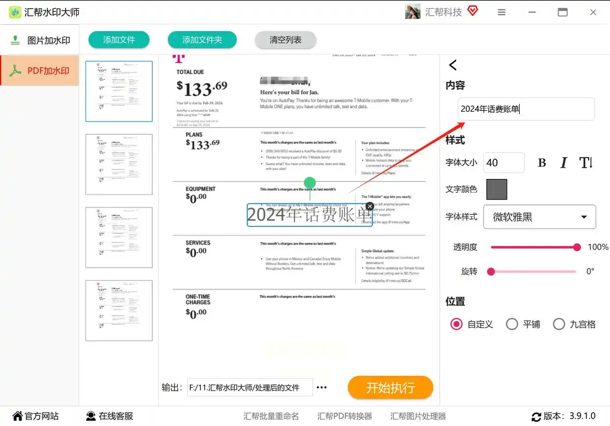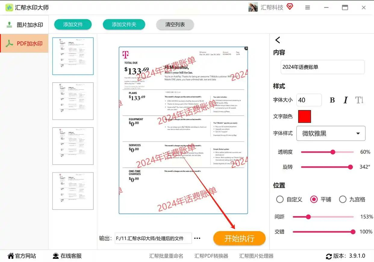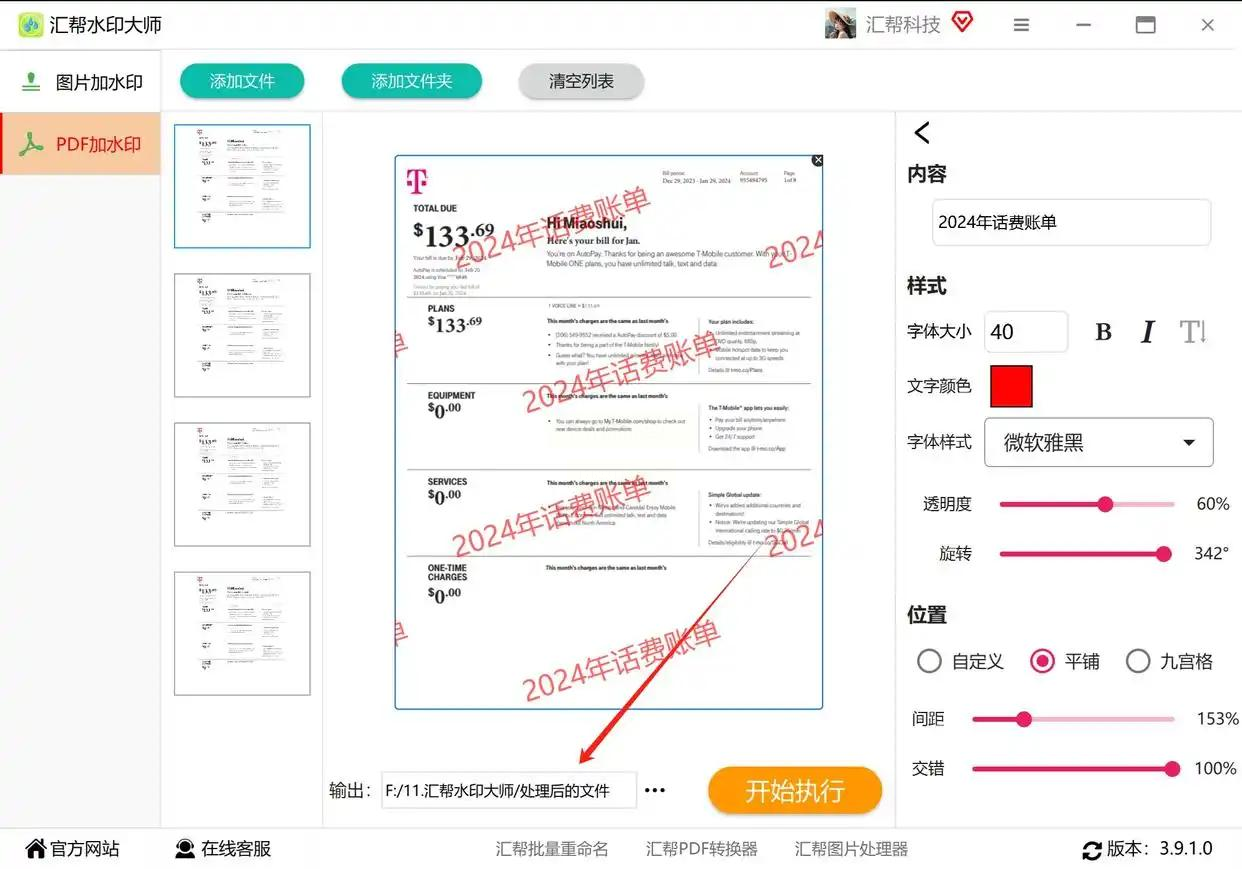 6. 开始处理并检查:点击“开始处理”按钮,软件会自动批量添加水印,进度条走完后,去刚才设置的文件夹里查看成品,每个PDF页面应该都已经带上了文字水印。