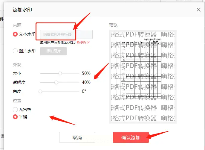 点击"添加文字水印",在弹出的设置窗口中,可以自由调整字体、大小、颜色和透明度。比如设置"内部资料"作为水印,字体选黑体,大小18号,颜色设为浅灰色,这样既醒目又不会遮挡正文。还能通过"旋转角度"和"位置分布"按钮调整水印的显示效果。
