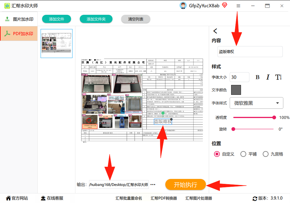 3. 加文字水印:点右边"文字加水印",会弹出编辑框,输入你要的水印内容(比如"盗版维权")