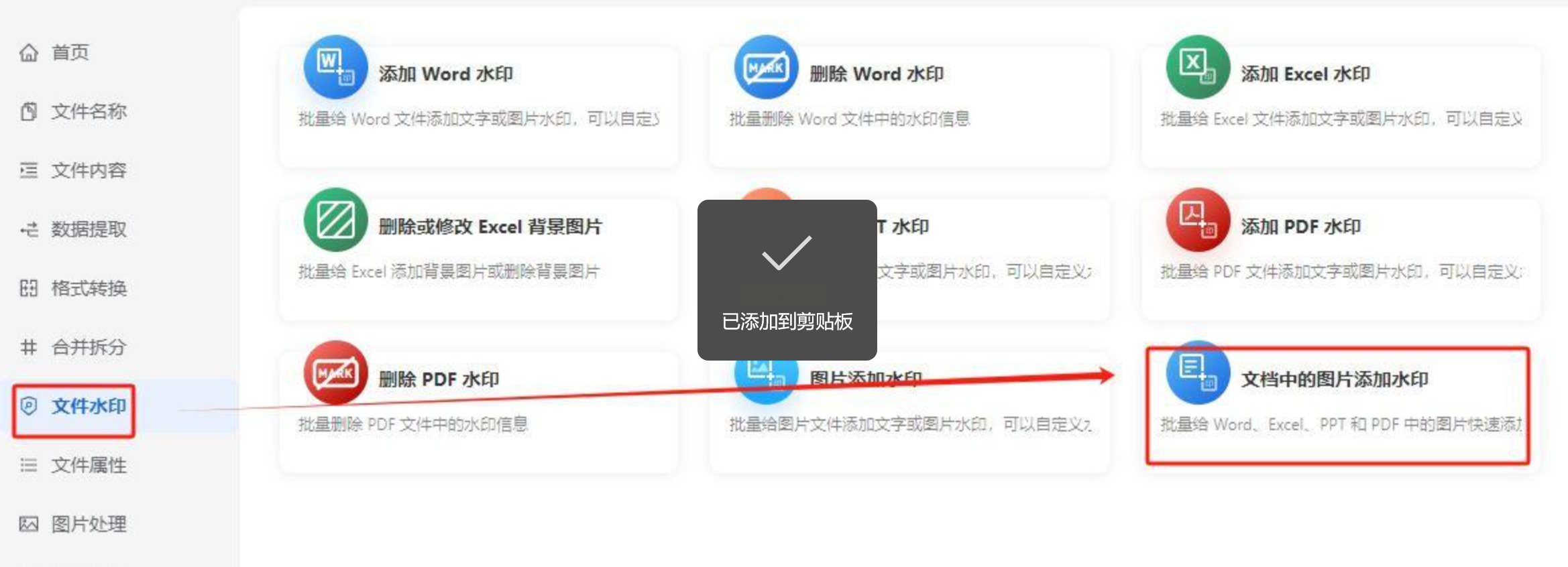 1. 打开软件:启动"我的ABC软件工具箱",在左侧菜单选择"文件水印"→"文档中的图片添加水印"。