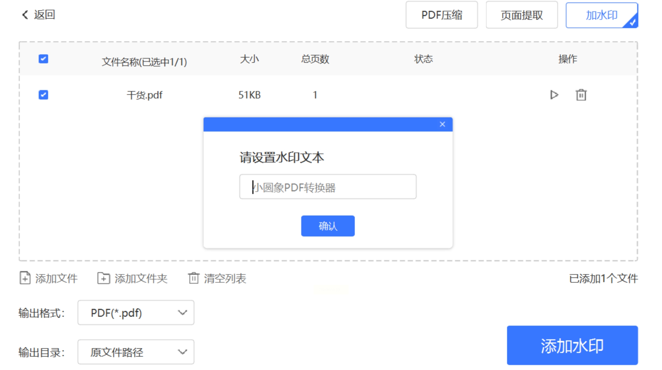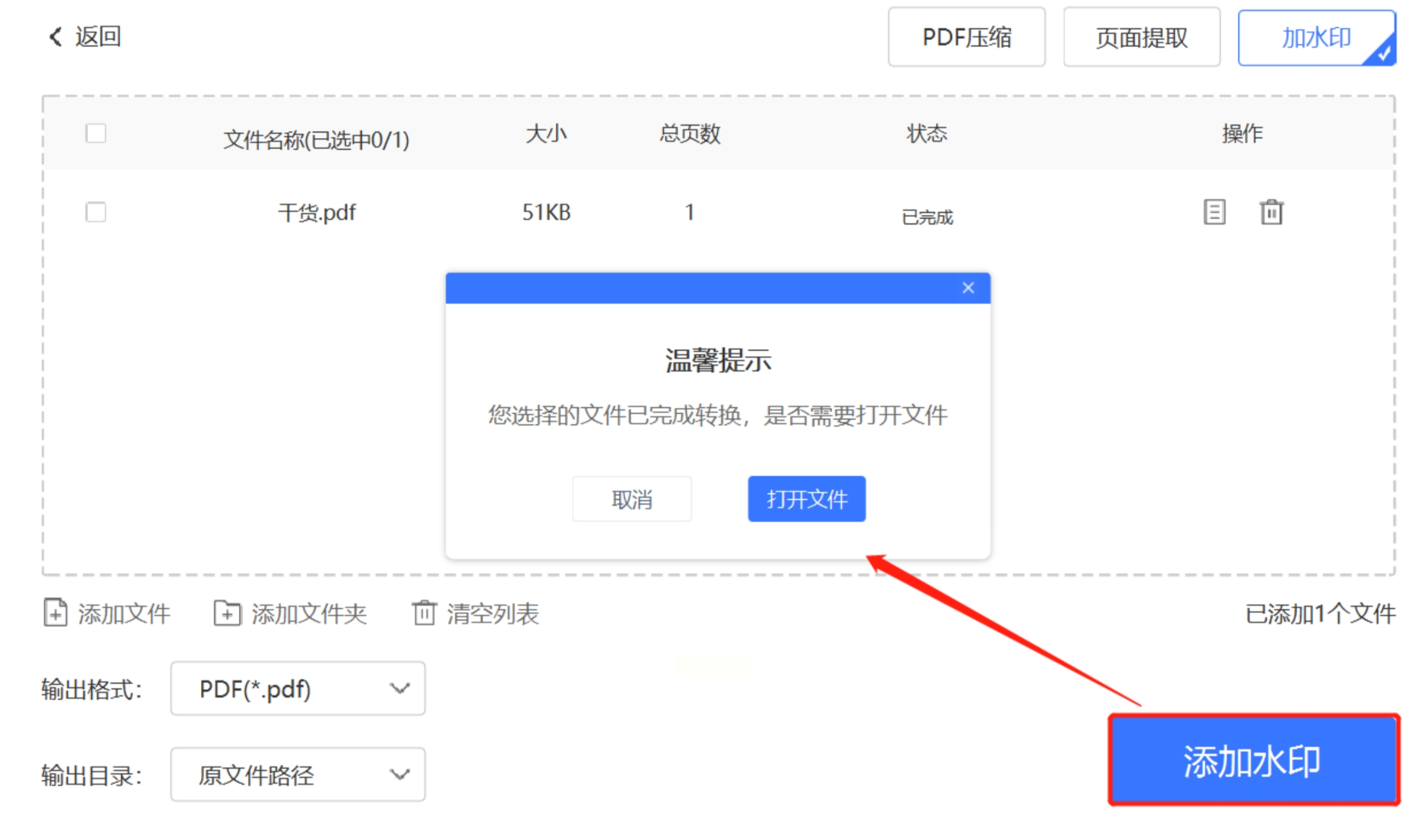 2. 添加文件:点击「添加PDF文件」,导入需要处理的文件(支持批量导入,最多50个文件