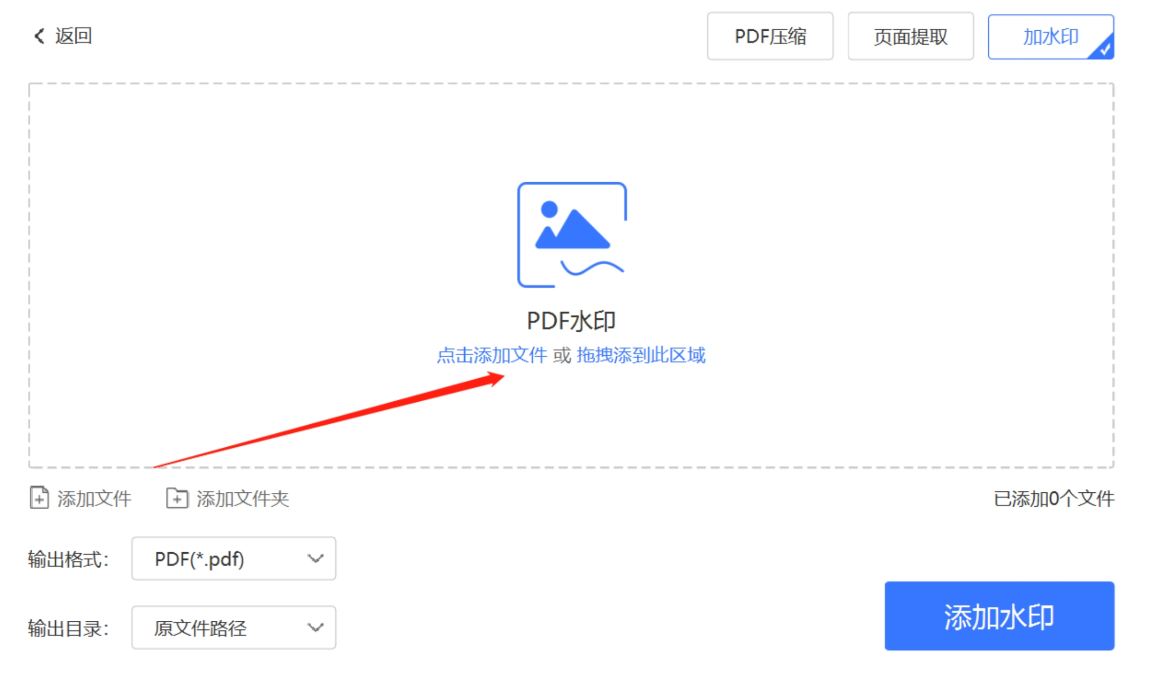 1. 选择功能:在左侧菜单点击「PDF加水印」,界面会显示"添加文件"按钮。