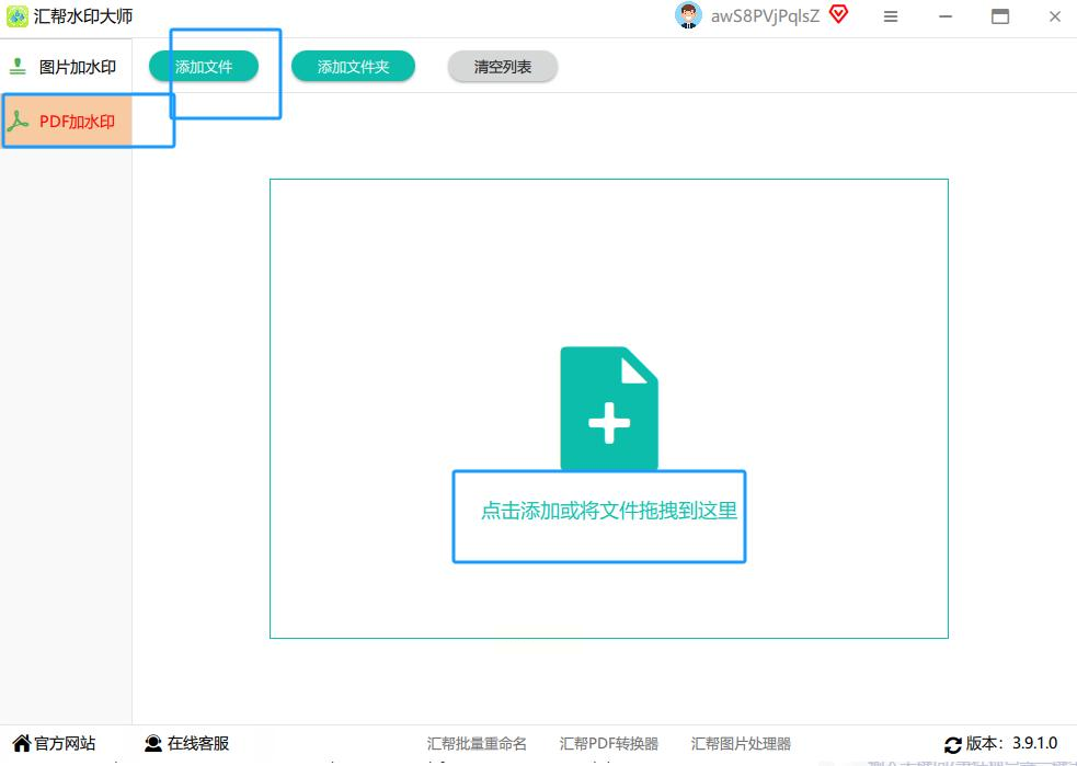 先找到汇帮水印大师,双击打开它。软件一启动,左边会跳出一排功能模块,你直接点“PDF加水印”就行,界面会瞬间切换到加水印的专属区域。
