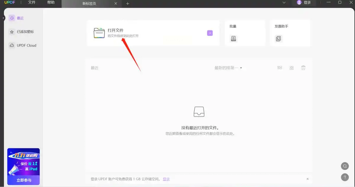 启动UPDF后,点击【打开文件】按钮选择目标PDF。