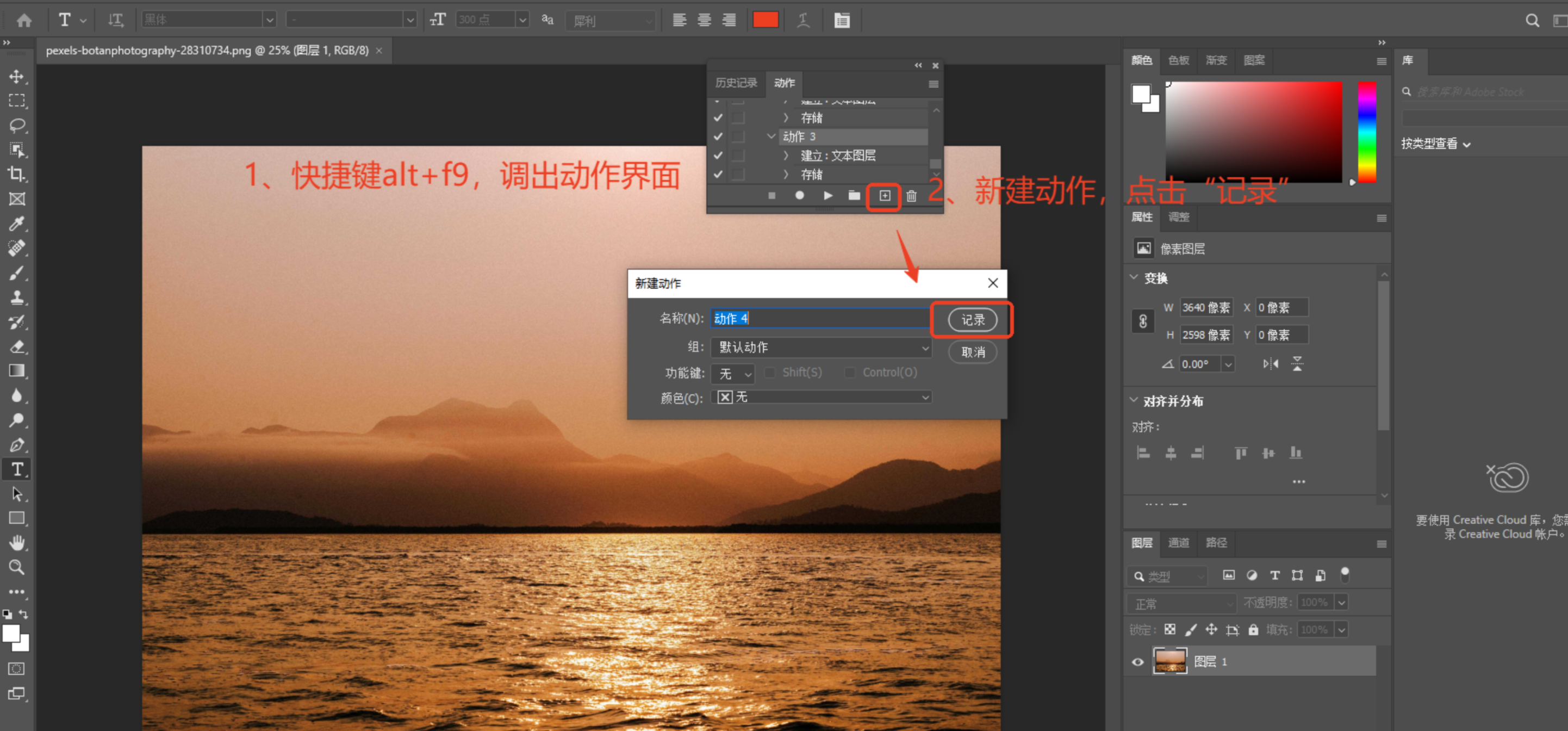 - 按Alt+F9打开动作面板,点击「创建新动作」