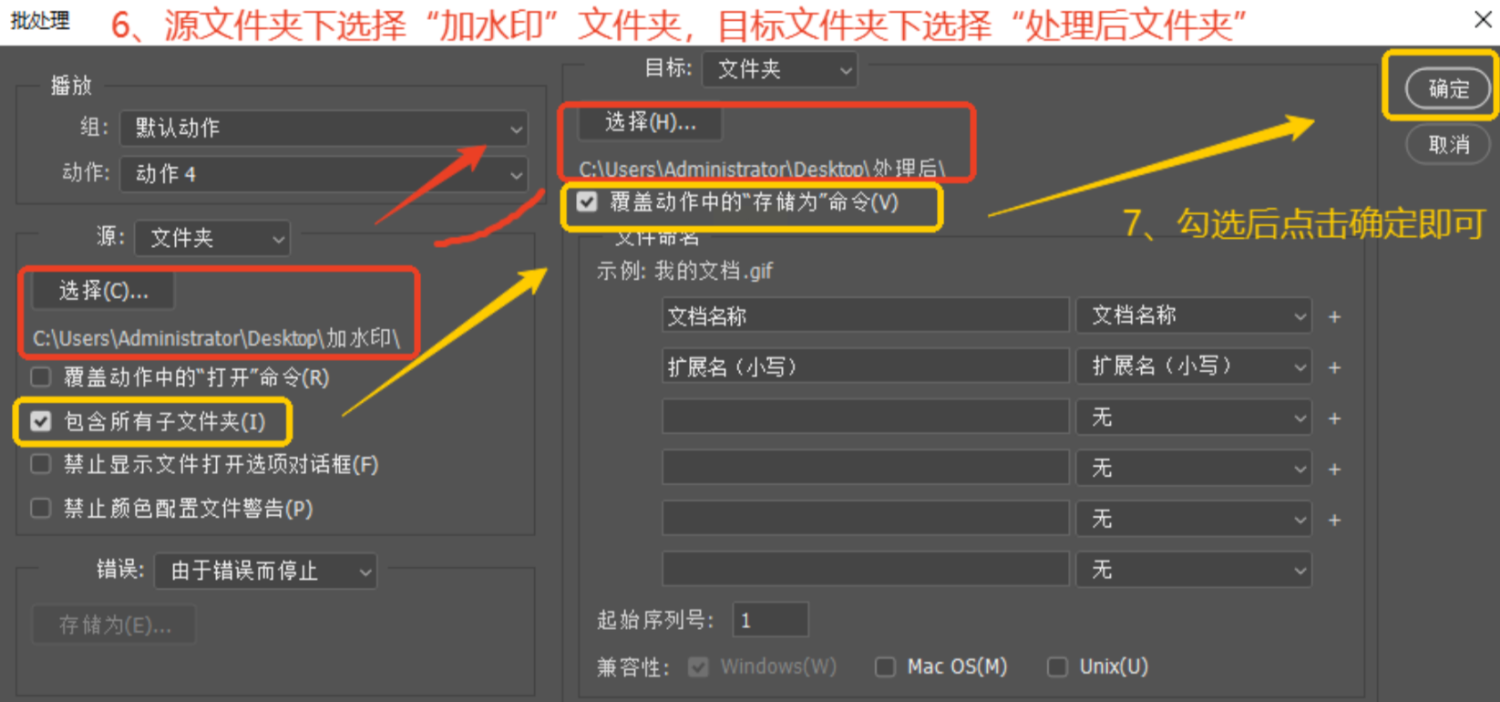 - 选择「加水印」文件夹作为源文件,「处理后」作为目标路径