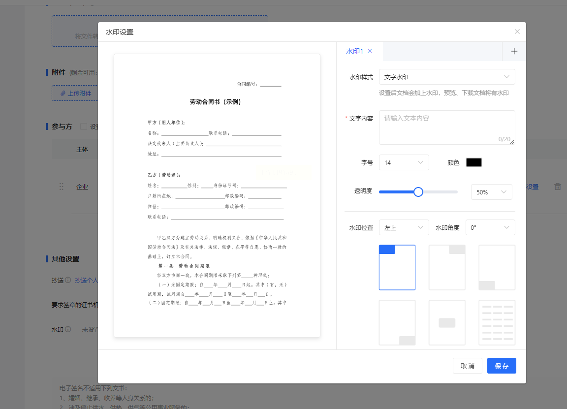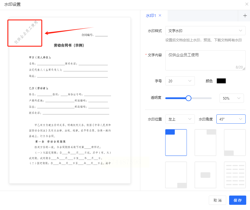 3. 调整水印效果:在设置界面中,可以自定义水印文字内容,比如"公司名称"或"内部资料"。调整好文字大小和透明度后,还可以选择水印的位置,比如居中、左下角等,确保水印不会影响合同内容的阅读。
