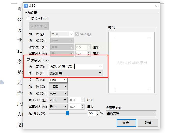 4. 编辑水印内容:如果选择"自定义水印",会弹出一个对话框。在对话框中,选择"文字水印",然后在内容框中输入想要添加的文字,比如"公司名称"或"机密文件"。可以调整字体、字号、颜色等参数,设置完成后点击"确定"。