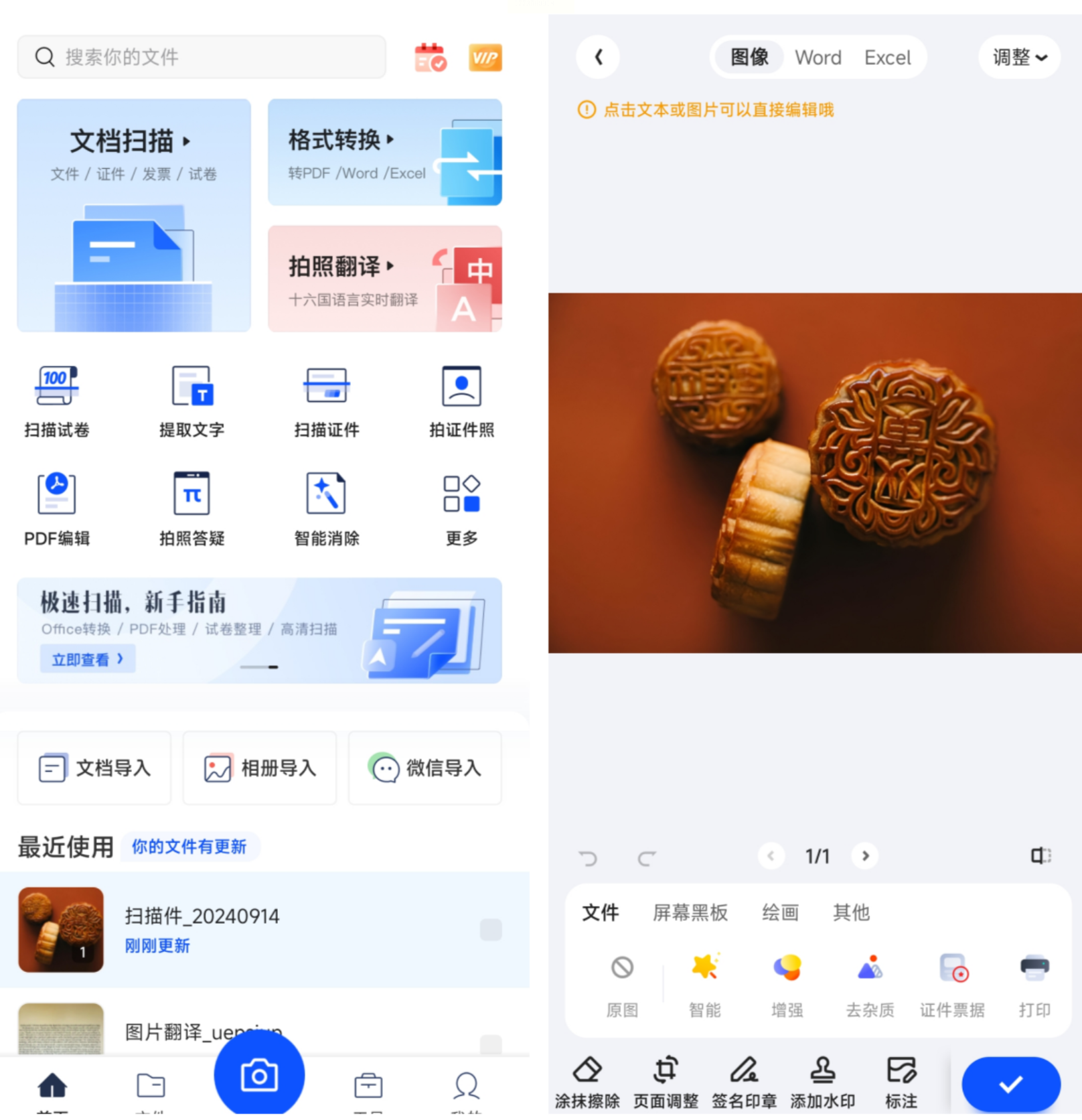 打开夸克扫描王,点击「相册」选择需处理的图片(支持JPG、PNG),或直接拍摄新照片。
