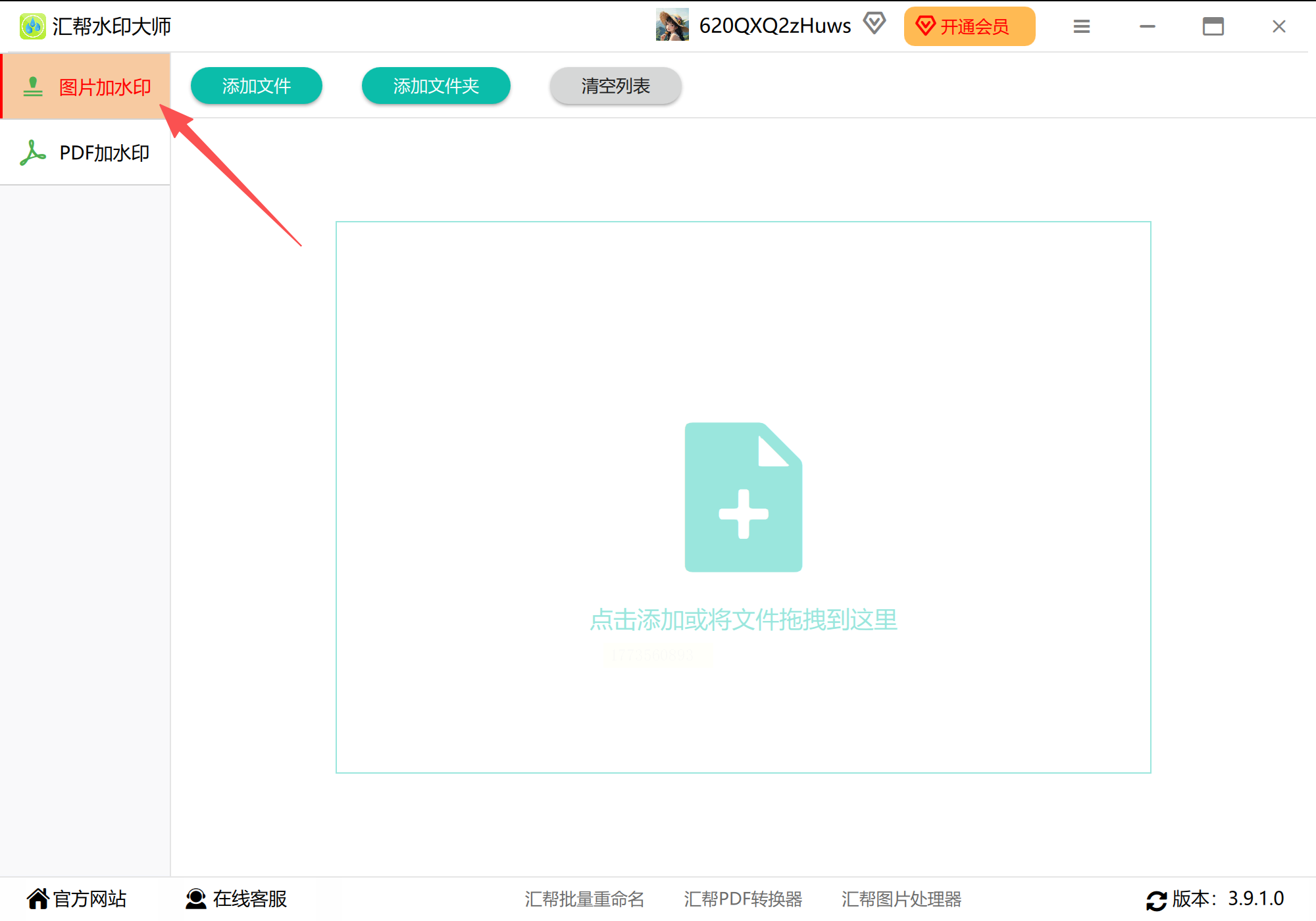 从官网下载“汇帮水印大师”,安装后打开主界面,左侧功能栏选择「图片加水印」。