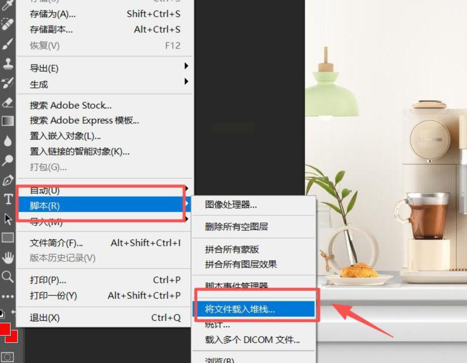 打开Photoshop,执行「文件」→「脚本」→「将文件载入堆栈」,选择所有需处理图片,按「确定」。