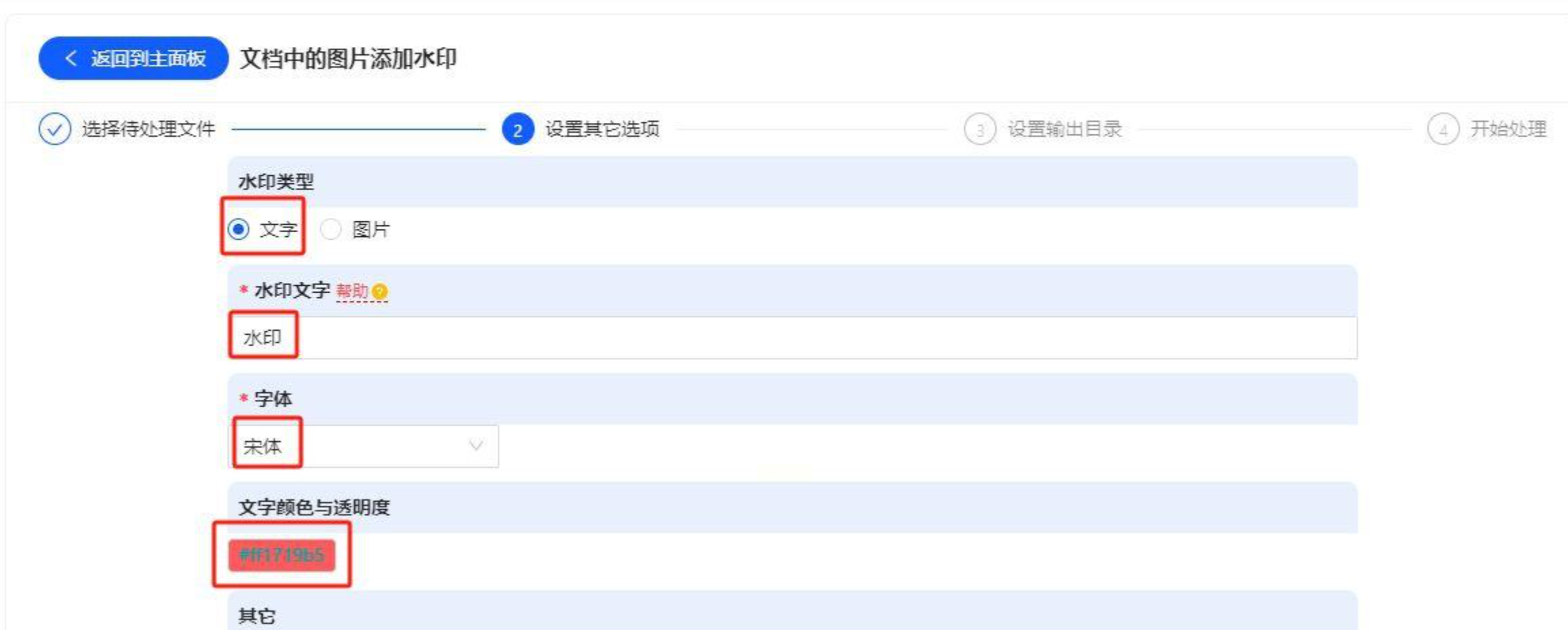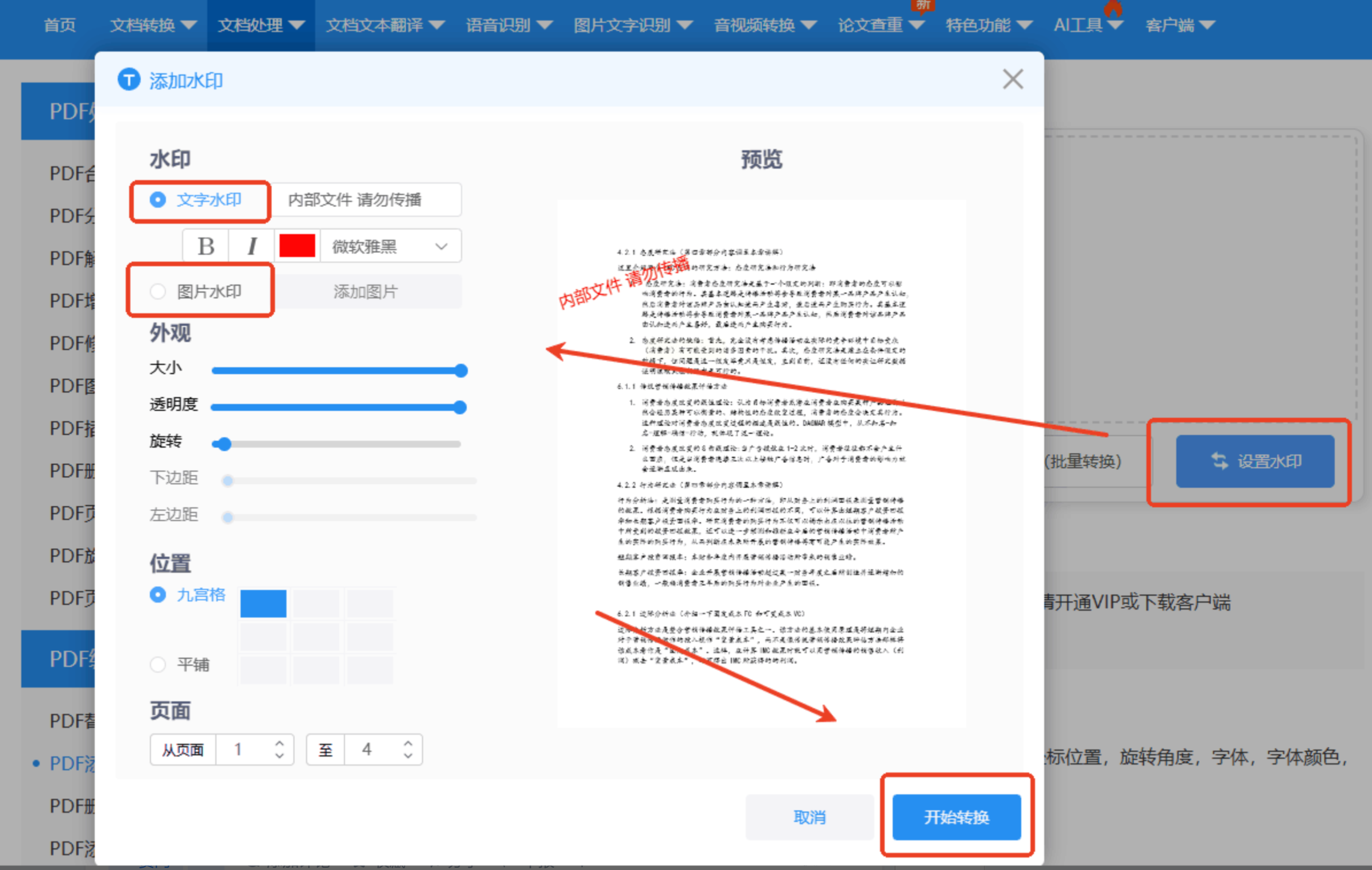 3. 设置水印:文字输入“草稿”,选字体、颜色、透明度,图片水印上传公司Logo。